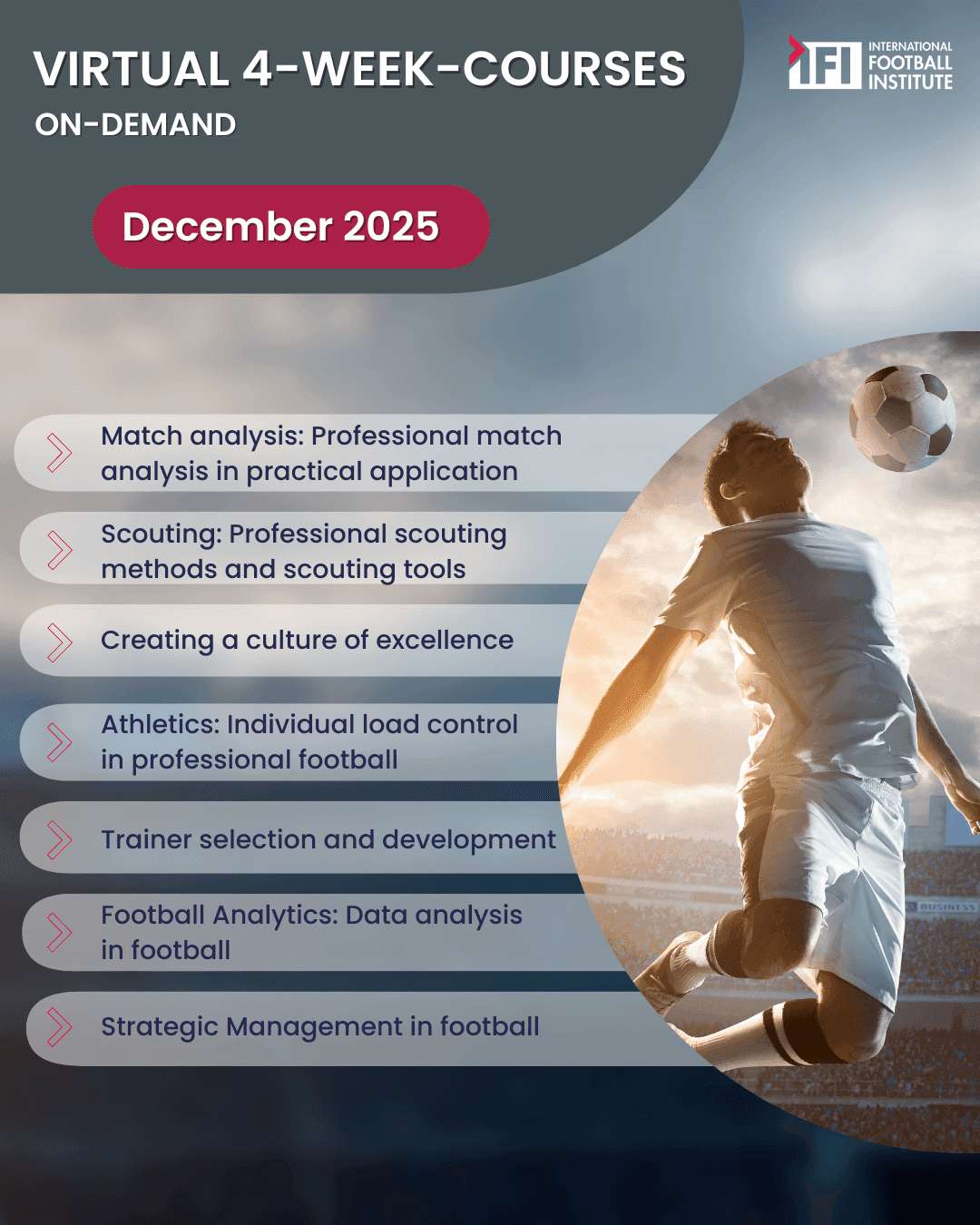 With your participation in our virtual 4-week programmes, you will expand your ability to become a qualified actor in the world of football, gaining a competitive advantage over your peers. Click here to learn more.