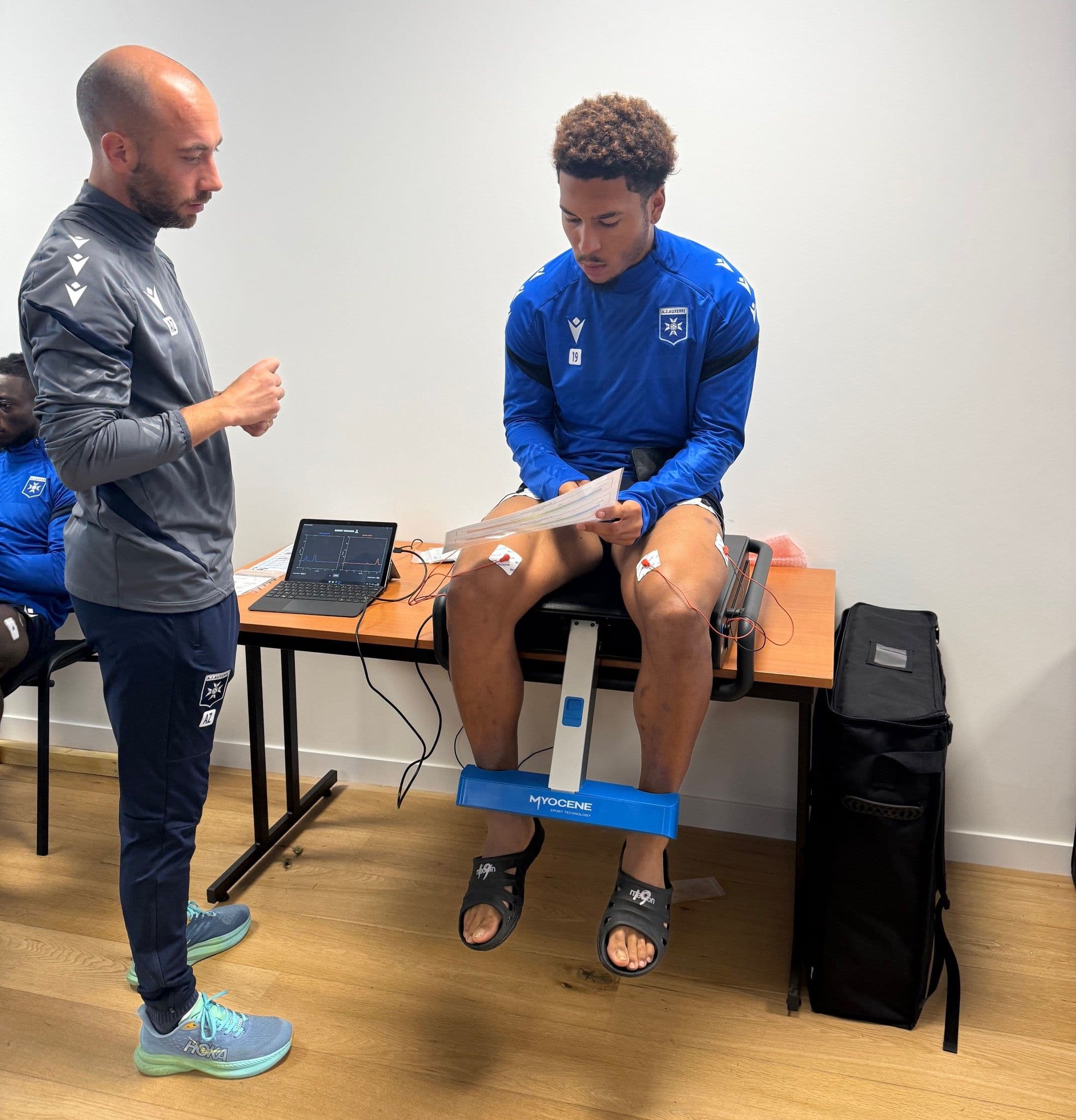 "The player sits down. Three electrodes are placed on each leg. The tool is connected to a portable computer and the measurement begins. Electrical impulses at low, medium, and high frequencies trigger muscle contractions. After 90 seconds, you obtain an index. It’s as simple as that.” Aurélien Denotti, Head of Performance at AJ Auxerre (Ligue 1), has been using Myocene twice per week since the start of the season. What is Myocene? A high-tech neuromuscular assessment device that is rapidly being adopted across elite sport. Its purpose: to objectively quantify muscle fatigue in order to preserve athlete availability and optimize injury prevention strategies.