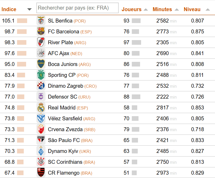 Benfica, Barça, River Plate ! Voici pour le podium du classement annuel des meilleures académies, réalisé par l’Observatoire du football CIES. Pour réaliser ce top 100, les chercheurs se sont basés sur un indice de formation prenant en compte le nombre de footballeurs formés par le club (à condition d'y avoir joué au moins trois saisons entre 15 et 21 ans), le niveau du club dans lequel ils évoluaient la saison dernière et le nombre de minutes disputées. Comme l’année dernière, Benfica se classe premier avec 93 joueurs formés évoluant dans les 49 ligues analysées, un niveau moyen des clubs de 0,81 et 2 582 minutes disputées en moyenne dans des rencontres officielles de la dernière année. Barcelone (76 joueurs, 0,87 et 2 773 minutes) et River Plate (97, 0,81 et 2 305 minutes) complètent le podium. Le Top 10 est composé d'une deuxième équipe portugaise (Sporting CP), d'une autre espagnole (Real Madrid), de deux argentines (Boca Juniors et Vélez Sarsfield), ainsi que de l'Ajax Amsterdam, du Dinamo Zagreb et des Uruguayens de Defensor. Pour trouver trace des clubs français, il faut se rendre à la 19ᵉ place avec le Paris St-Germain, tandis que l’Olympique Lyonnais est 34ᵉ et le Stade Rennais 44ᵉ.