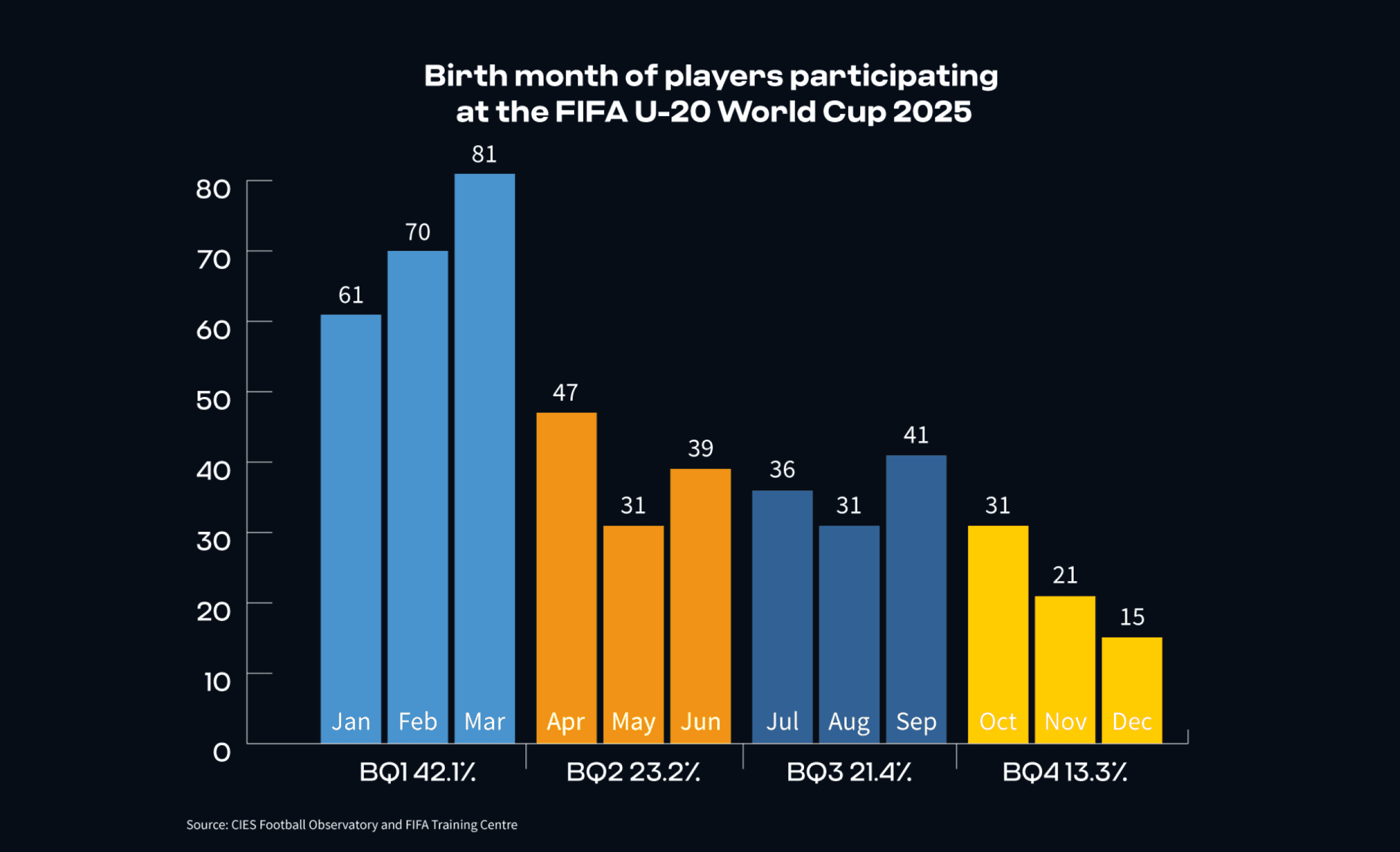 Une étude menée à l’issue de la dernière coupe du monde FIFA U20 (disputée au Chili et remportée par le Maroc) démontre une nouvelle une fois l’importance du trimestre de naissance pour les jeunes joueurs. L’analyse réalisée conjointement par le Centre technique de la FIFA et le CIES (le Centre International d’Étude du Sport) pointe ainsi que 42, 1 % des 504 joueurs ayant participé à l’édition étaient nés entre janvier et mars. Un pourcentage à rapporter aux 13,3 % des jeunes nés dans le dernier trimestre (voir par ailleurs). Les auteurs de l’étude expliquent : « Ce résultat s'explique par le fait que les footballeurs nés entre octobre et décembre ont moins de chances d'être sélectionnés par les meilleurs clubs et les équipes nationales de jeunes, ce qui limite leurs opportunités de s'entraîner, de jouer et de progresser au plus haut niveau. À l'inverse, cela avantage les joueurs plus âgés, notamment ceux nés entre janvier et mars, qui ont un meilleur accès à l'entraînement et à la compétition, et par conséquent une progression plus rapide. »