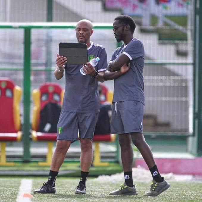 El Hadji Abdoulaye Seck (à droite), analyste vidéo pour la sélection de Mauritanie avec l'ancien sélectionneur, Amir Abdou / ©DR