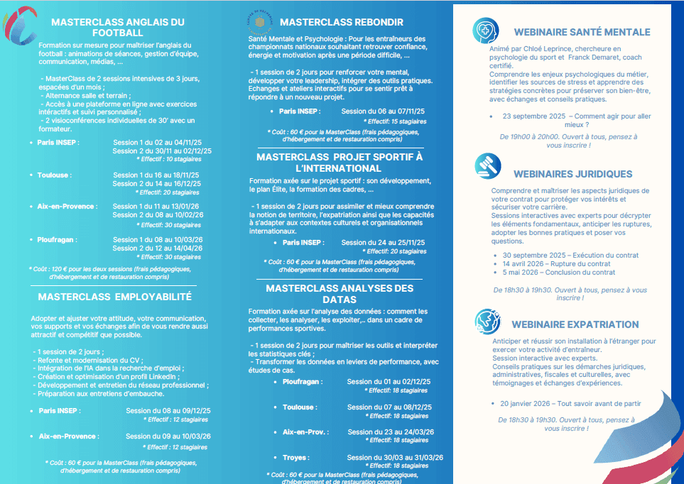 L’Union nationale des entraîneurs et cadres techniques professionnels du football (UNECATEF) lance un dispositif ambitieux de Masterclasses et de Webinaires (toutes les informations ICI), offrant aux entraîneurs "des formations courtes, pratiques et ciblées, conçues pour répondre à leurs besoins concrets". Parmi les premières initiatives : la maîtrise de l’anglais, devenue indispensable dans un environnement marqué par l’internationalisation croissante des effectifs et des instances dirigeantes. Rendez-vous donc à Paris (INSEP) du 2 au 4 novembre, puis du 30 novembre au 2 décembre ou à Toulouse (CREPS) du 1ᵉʳ au 18 novembre et du 14 au 16 décembre 2025, afin d'assister aux deux premières Masterclass "Anglais du football". Une formation qui se déroule en deux sessions intensives de trois jours, entrecoupées de deux entretiens individuels de 30 minutes avec un formateur et complétées par un accès à une plateforme en ligne (proposant exercices interactifs et suivi personnalisé). Et une occasion idéale pour les coachs qui souhaitent renforcer leur anglais !