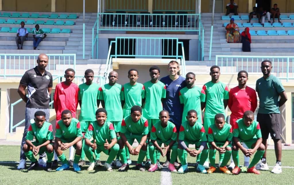 Thierry Pinot (au centre), "Talent Coach" pour la FIFA aux Comores, pose avec la catégorie U15 de l'académie nationale qu'il vient de créer avec son staff / ©DR