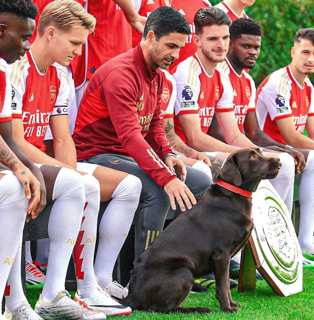 Mikel Arteta, l'entraîneur d'Arsenal a fait adopter le chien "win" lors de la fin de saison 2022/2023 / ©Arsenal