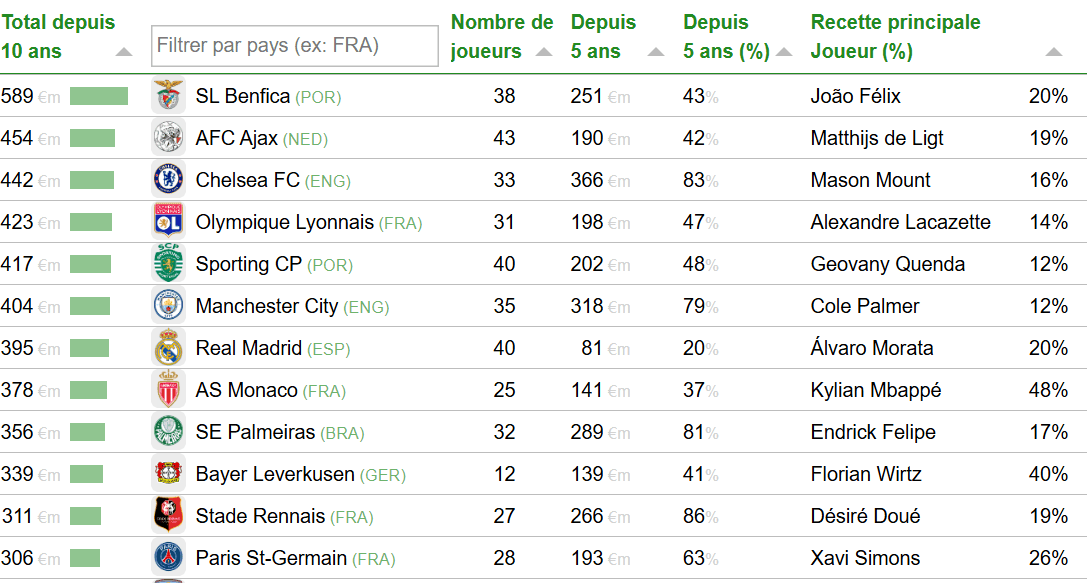 Quels sont les centres de formation les plus rentables depuis dix ans ? Voici la question que se sont posée les chercheurs du CIES dans leur dernière étude qui dévoile le classement des 100 clubs ayant généré le plus de revenus grâce aux transferts de joueurs issus de leur centre de formation. En tête, le SL Benfica domine largement avec 589 M€, devant l'Ajax Amsterdam (454 M€) et Chelsea FC (442 M€), confirmant la puissance des modèles de formation portugais et néerlandais. Côté français, deux clubs se hissent dans le top 10 : l'Olympique Lyonnais (4ᵉ) et l'AS Monaco (8ᵉ), tandis que le Stade rennais (11ᵉ) et le Paris Saint-Germain (12e) viennent confirmer la densité du modèle français. Au total, douze clubs de Ligue 1 figurent dans le top 100, faisant de la France le deuxième pays le plus performant derrière l'Angleterre, avec près de 3 milliards d’euros générés. Autre enseignement : sur les cinq dernières années, Chelsea FC prend la tête avec 366 M€, devant Manchester City (318 M€), témoignant du développement des académies au sein même des clubs d’élite anglais, capables à la fois d’alimenter l’équipe première et de générer des revenus significatifs via le marché des transferts. La formation s’impose plus que jamais comme un pilier économique et stratégique pour les clubs professionnels.