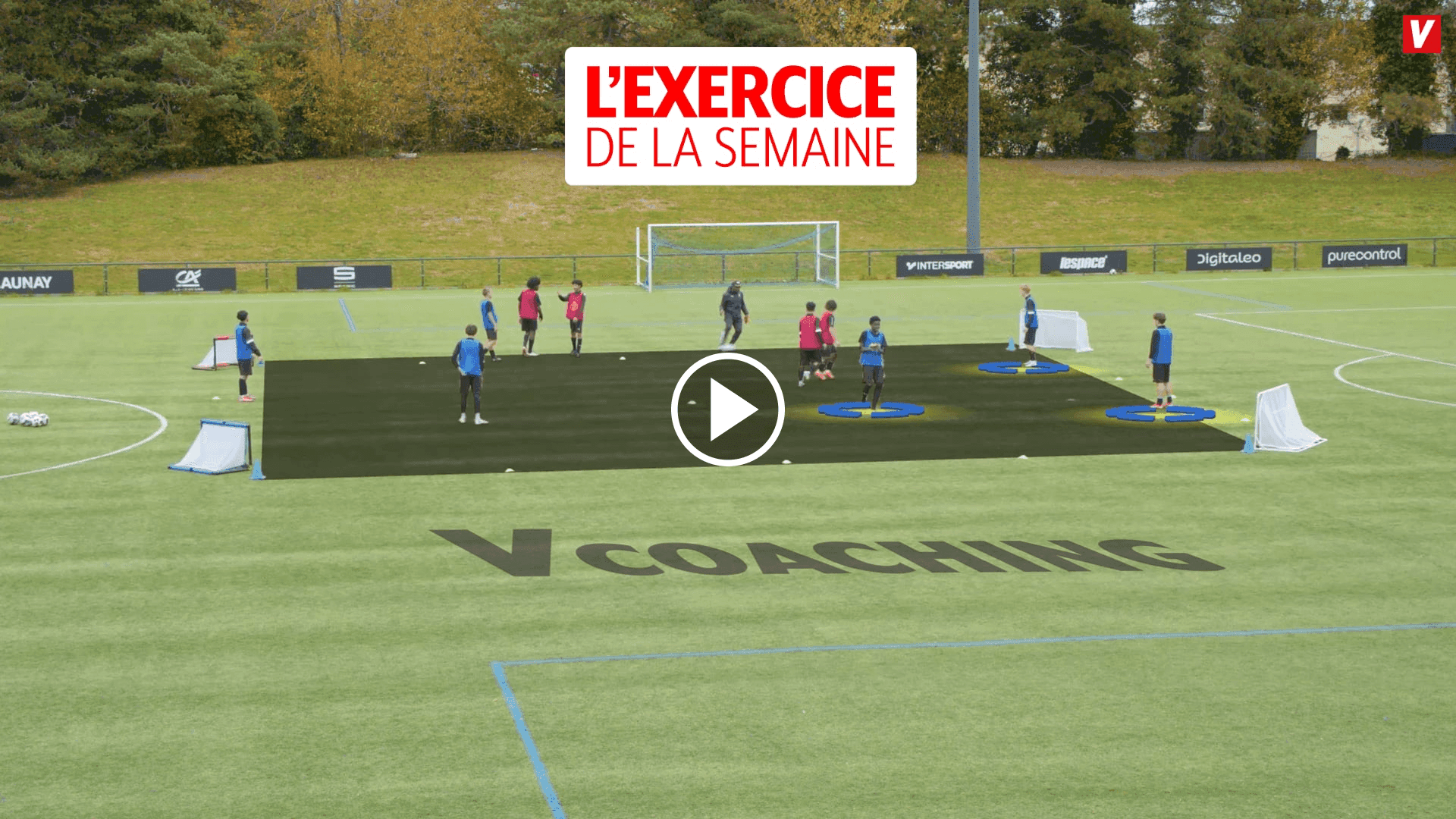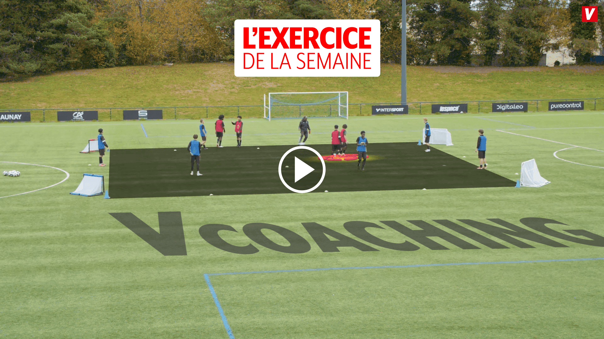 Jeu de conservation à 3 contre 2 sur chaque moitié de terrain avec 2 minibuts à attaquer et à défendre à la transition (perte de balle).