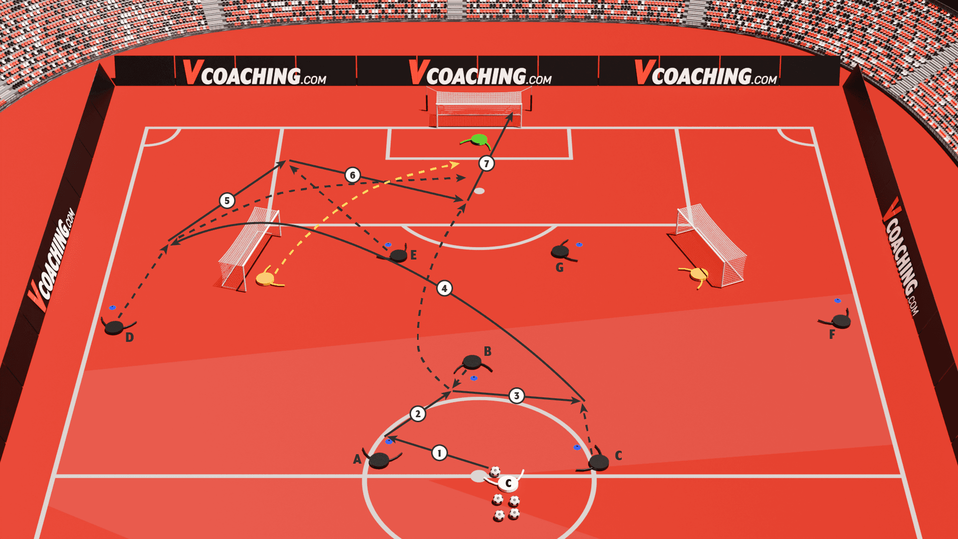 3 joueurs aux postes au centre (A, B, C), 2 postes sur les ailes (D et F), et deux « attaquants » (E et G). Deux défenseurs jaunes se tiennent à hauteur du poteau du but placé comme sur le schéma.