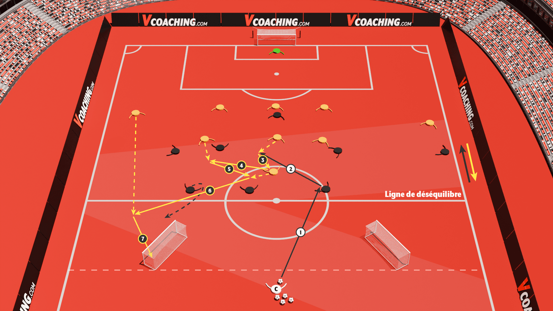Passes noires de fixation dans l’axe (varier les circuits et les échanges) puis passe aérienne au-dessus du but mobile en direction de C, lequel dévie directement ou contrôle et passe à destination de E qui effectue un appel en diagonale (intervalle figurant l’espace entre un défenseur central et l’arrière latéral) pour centrer. B et D jouent la finition face au gardien et contre le défenseur jaune « battu » par la passe aérienne et qui revient en situation de déséquilibre.