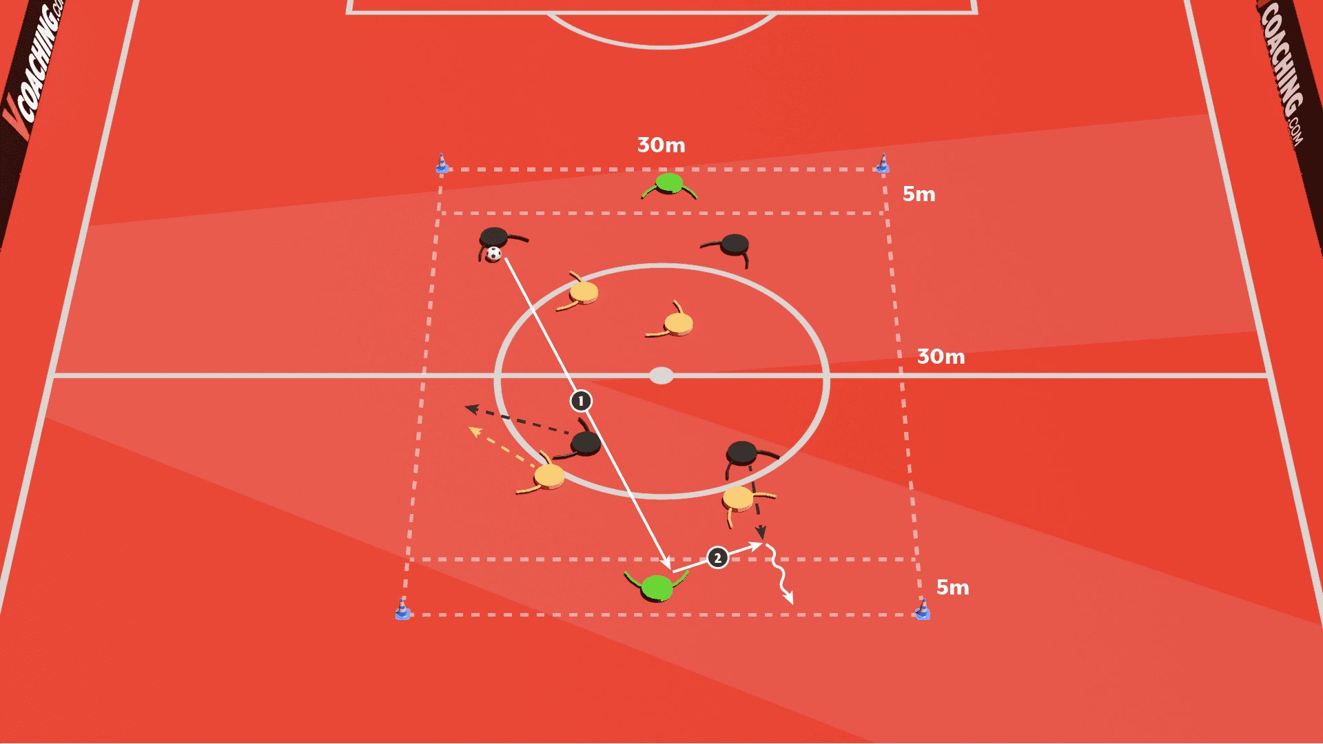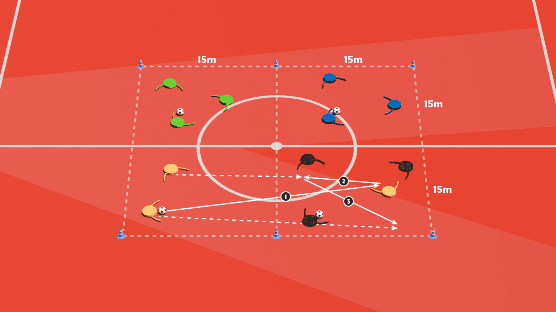 Organisation : espace de 30 x 30 m divisé en 4 zones, avec 3 à 4 joueurs par zone.