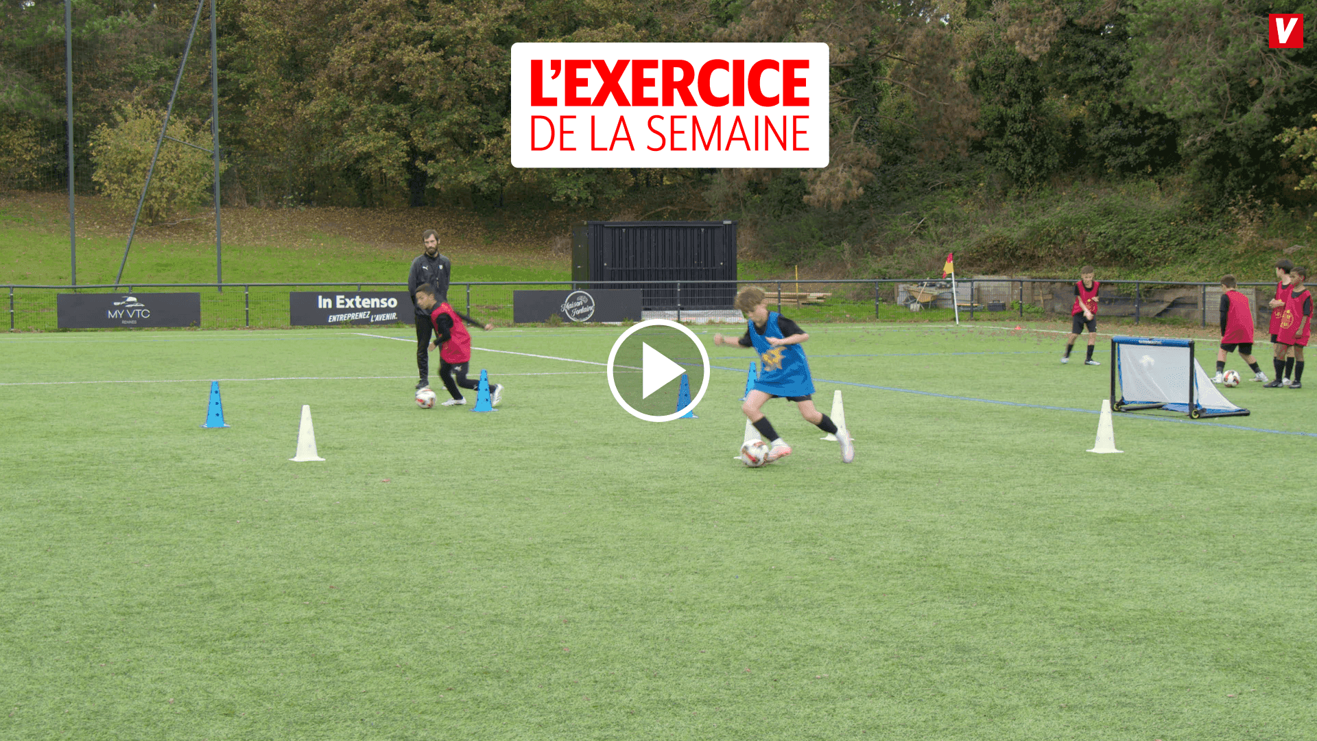 Voici un exercice simple et efficace de slalom balle au pied, en compétition par deux équipes, avec finition sur minibut et utilisation de planches à rebonds (variante).
