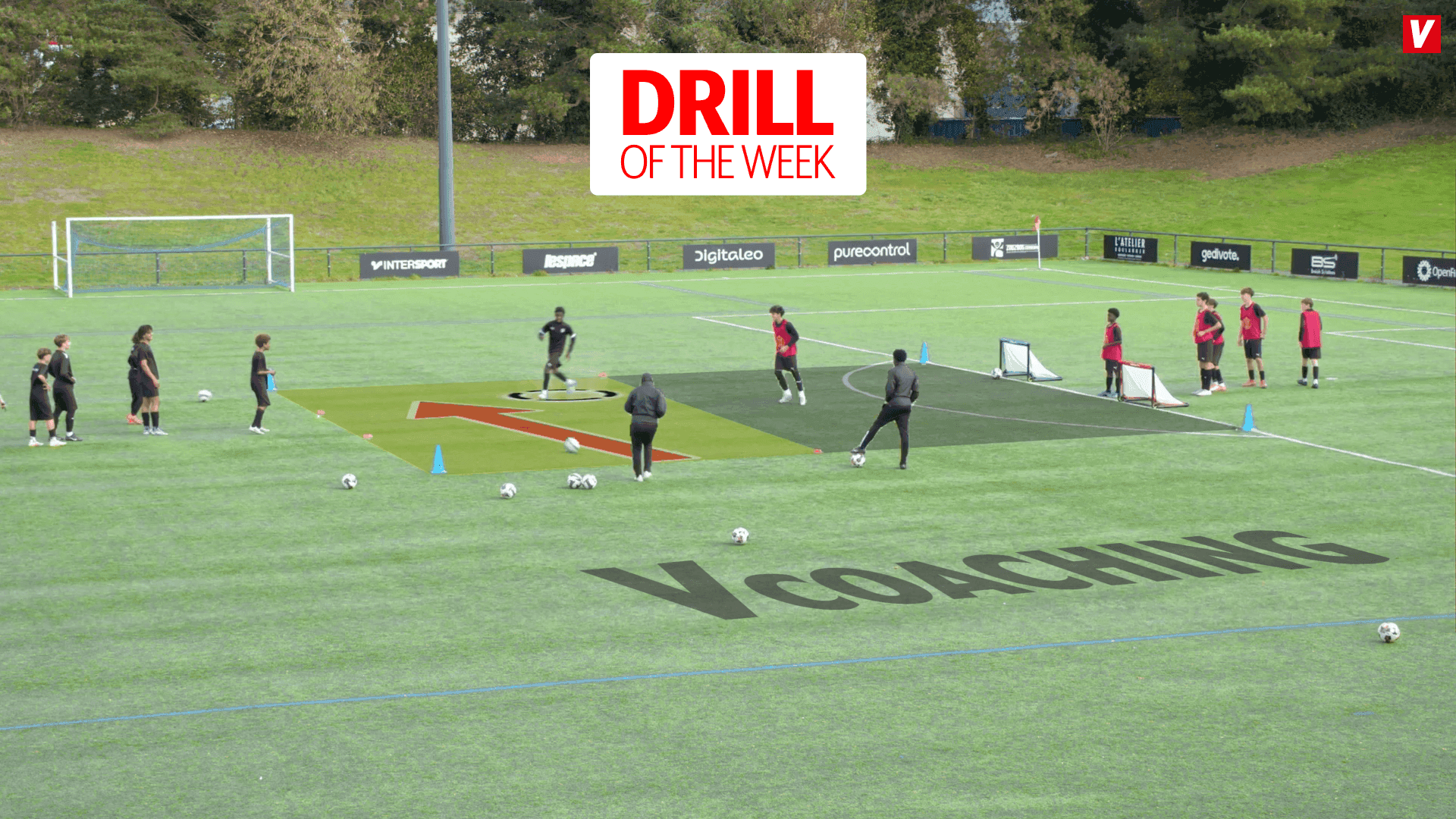 Here is a perfect exercise for practicing one vs one situations, while promoting speed, feints, and changes of direction to finish on one of the two mini goals.